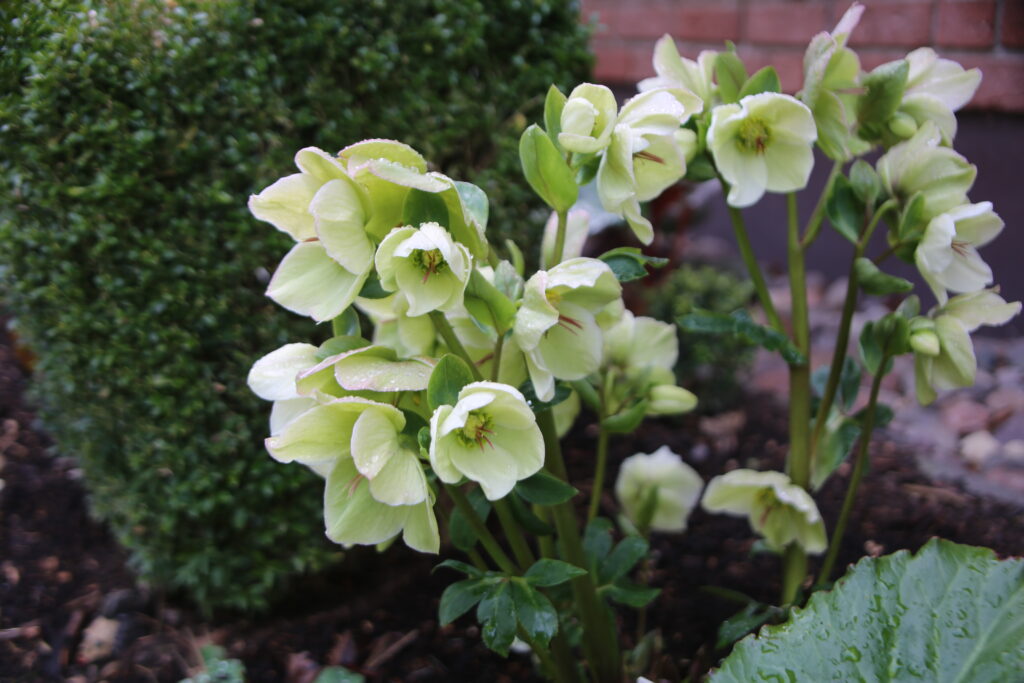 Bekommt man im Winter einen großen Topf mit blühenden Lenzrosen geschenkt, dann ist die Freude groß und man lässt sie im Zimmer, bis sie abgeblüht ist. Nach Wochen wandert sie in den Garten. Wer nun vergisst sie wirklich regelmäßig und kräftig zu düngen, der erlebt, dass aus der hochgezüchteten Pflanze im darauffolgenden Jahr ein Kümmerling wird. Das kann unter Umständen sogar mit Düngung passieren. Aber Geduld, wird die Lenzrose gut versorgt, erholt sie sich wieder und passt sich an das Klima im Garten an, blüht im nächsten oder übernächsten Jahr wieder gut. Bleibt die Pflege, wird die Blüte üppiger. Lenzrosen sind wirkliche Dauerblüher. Meist fangen sie im Dezember oder Januar an, (es hängt von der Temperatur ab) machen jetzt Anfang April immer noch eine beeindruckende Figur. Die großen Blätter schneide ich weg, dann kommen die Blüten besser zur Geltung. Die weiße Ice and Roses hat ihren Platz direkt neben den Stufen zum Eingang, wird immer wieder beachtet und bestaunt.